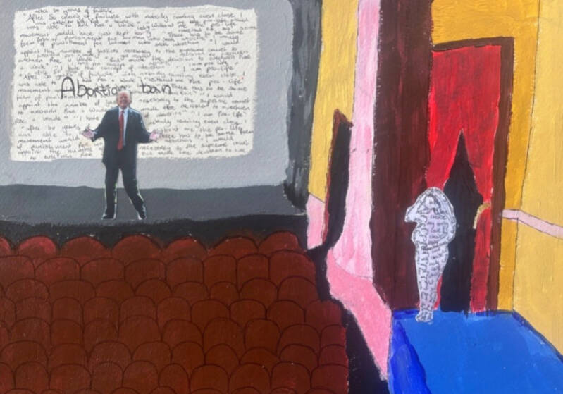 Eva heeft een werk gemaakt over de abortusban in Amerika. Dit is nu natuurlijk een heel actueel onderwerp, vooral in Amerika. Trump verbied vrouwen keuzes te maken over hun eigen lichaam dus dit is een heel goed onderwerp om een werk over te maken. Ze legt duidelijk uit hoe zij op haar kunstwerk is gekomen, ze verteld over de compositie en het idee erachter. Het is een mooi werk met een goeie boodschap. Het is duidelijk wat ze er mee bedoeld en wat ze daarbij wil zeggen. Doordat Eva ervoor heeft gekozen bepaalde dingen niet te tekenen zoals Trump en de andere mensen zorgt het ervoor dat boodschap er echt uitspringt.